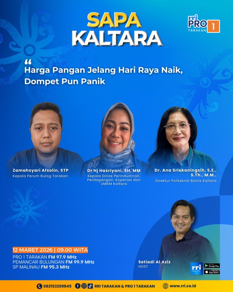 TARAKAN – Dr. Ana Sriekaningsih, S.E., S.Th., M.M., Direktur Politeknik Bisnis Kaltara, menjadi narasumber dalam program Sapa Kaltara yang disiarkan RRI Pro 1 Tarakan pada 12 Maret 2026. Dalam acara ini, Dr. Ana membahas dampak kenaikan harga pangan menjelang hari raya dan langkah-langkah yang perlu diambil. Program ini juga menghadirkan Zamahsyari Afsolin, STP (Kepala Perum Bulog Tarakan) dan Dr. Hj Hasriyani, SH, MM (Kepala Dinas Perindustrian, Perdagangan, Koperasi, dan UMKM Kaltara).