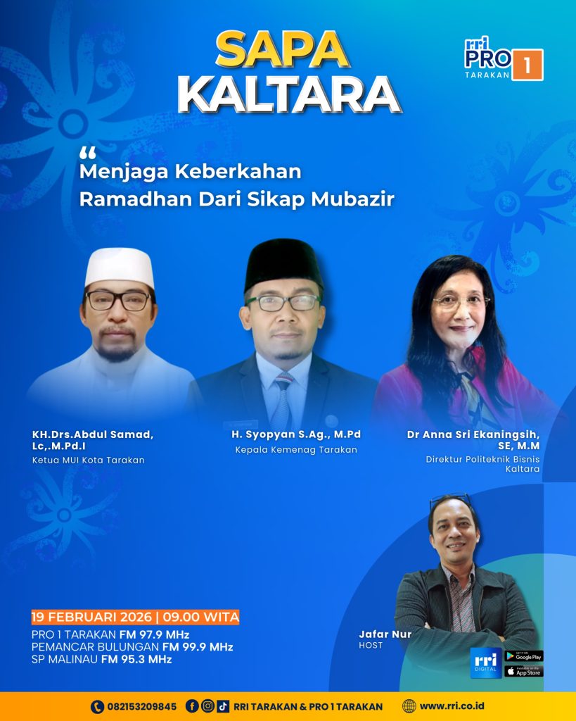 Tarakan – Program dialog Sapa Kaltara di Pro 1 RRI Tarakan mengangkat tema “Menjaga Keberkahan Ramadhan dari Sikap Mubazir” pada 9 Februari 2026 pukul 09.00 WITA.